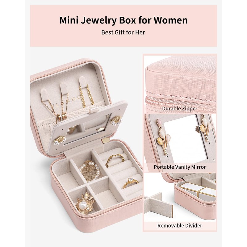 Vlando Small Travel Jewelry Box Organizer -Jewelry Display Case for Girls Women Bridesmaid Gift Rings Earrings Necklaces Storage with Mirror Pink