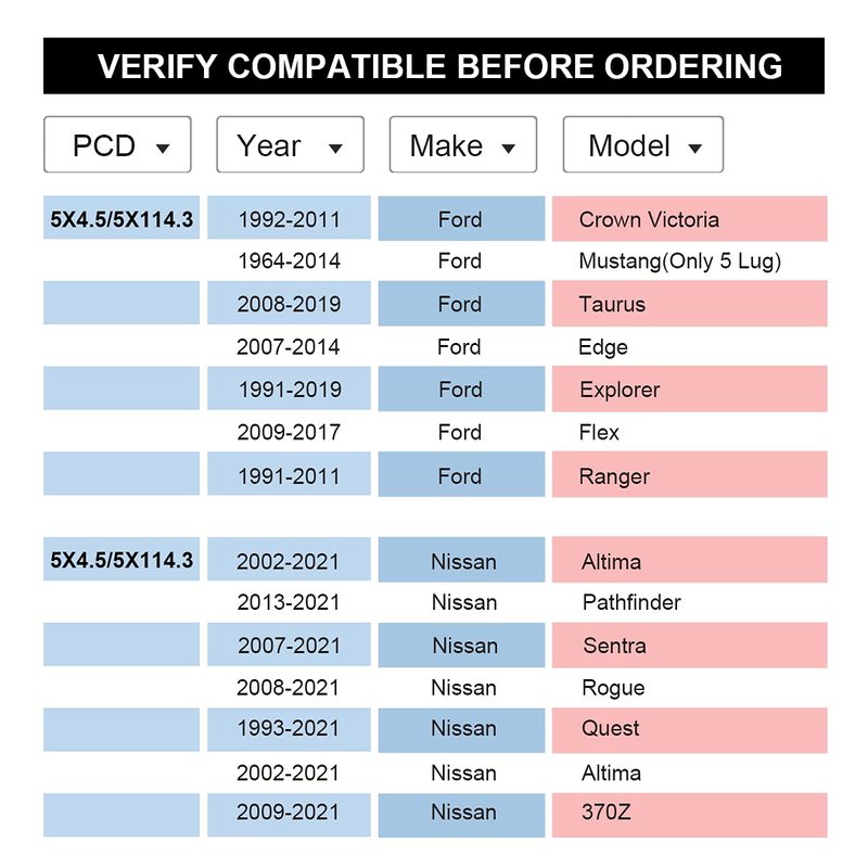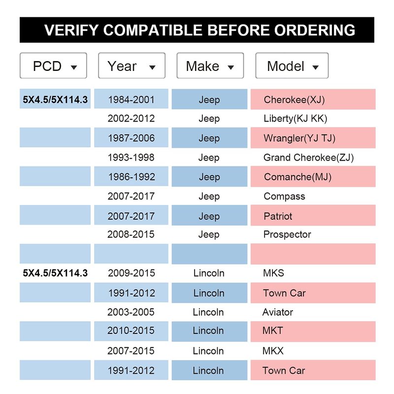 - 【Applications】Fit vehicles with 5x4.5/5x4.75/5x114.3/5x120.65 bolt pattern, compatible with Jeep-Ford-Toyota-Honda-Nissan-Hyundai-Chevy 5 Lug: 1984-2001 Cherokee(XJ), 2002-2012 Liberty(KJ KK), 1987-2006 Wrangler(YJ TJ); 1964-2014 M-u-s-tang, 1991-2010 Explorer, 1991-2011 Ranger; 1992-2022 Camry, 2002-2022 Highlander, 2005-2015 Tacoma, 1995-2022 R-A-V-4; 1998-2022 Accord, 2006-2022 Civic; 1993-2022 Pathfinder, 2007-2022 Sentra and more other 5 Lug vehicles. DO NOT FIT 5x120 5x127 Bolt Pattern.