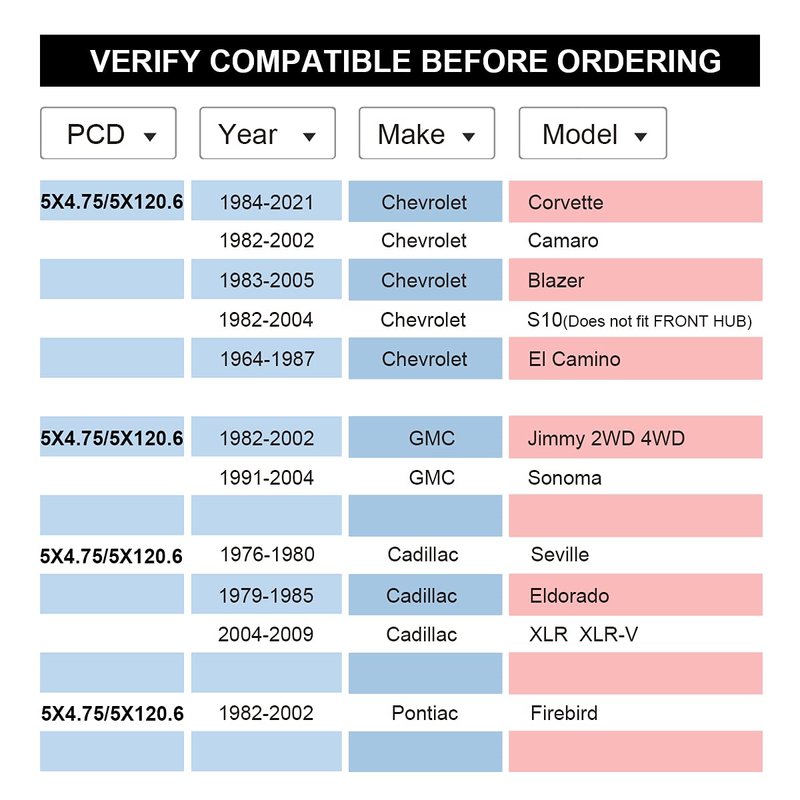 Please verify the bolt count, bolt circle diameter, center bore, and bolt size match your vehicle before ordering.