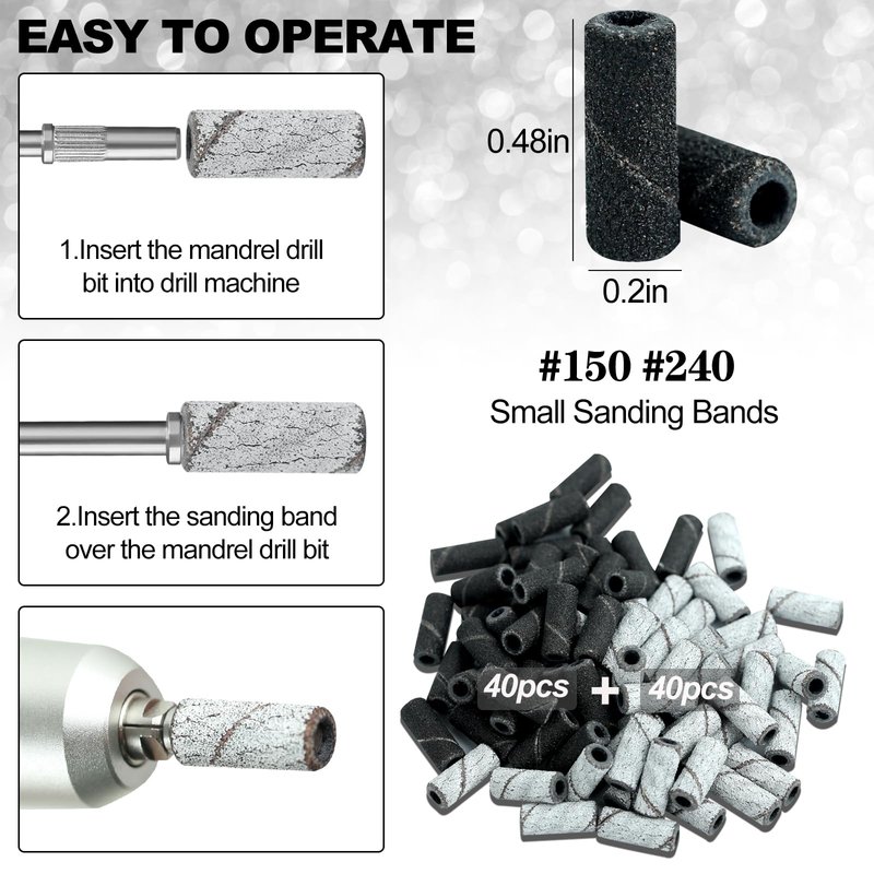 - Precise Nail Shaping: These small sanding bands and small mandrel bits are perfect for smaller nail plates and provide optimal finesse when preparing the underside of gel. Whether you need to file the edges, remove excess length, or shape the surface of the nails, this set provides the necessary precision and control.