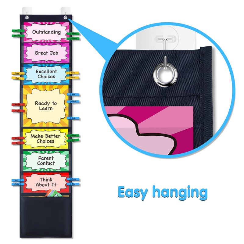 - Creative Behavior Reward Chart: Hanging foldable pocket chart is made from durable material, 7 clear pockets for displaying positive behavior in the classroom or at home, 14 pcs colorful cards(NOT PREPRINTED) and 40 pcs Upgraded larger colorful clothespins included, 1 pocket underneath for easy to storage markers, cards and clothespins.