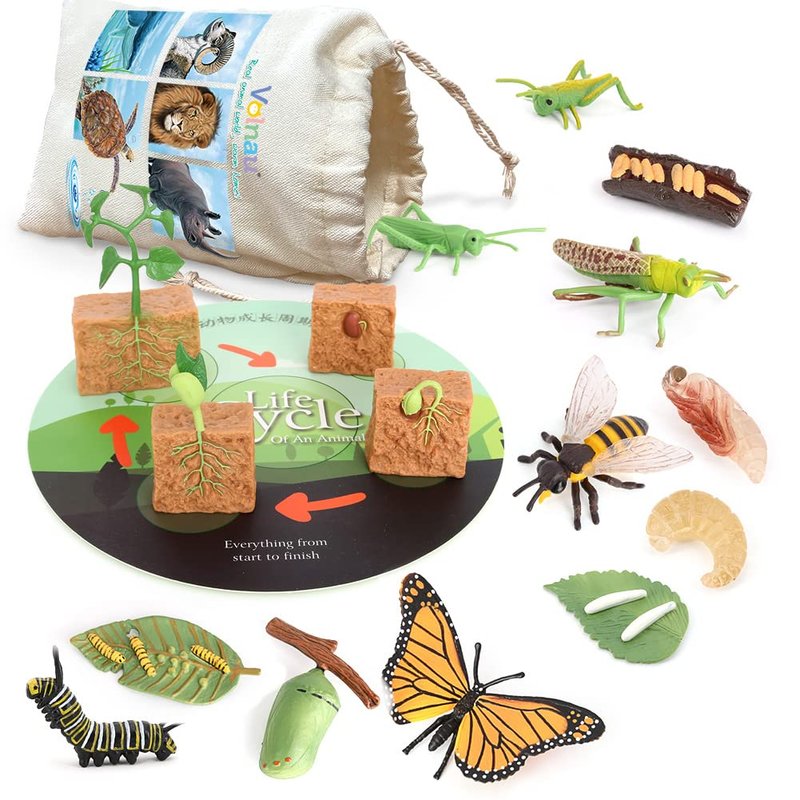 Volnau Animal Figurines Toys 16PCS Life Cycle Set Plant Locust Butterfly Caterpillars Bee Animal Figures for Toddlers Kids Decorations Preschool Educational Prop