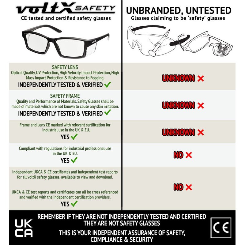 Another first from voltX. Full vision reading strength safety specs available in +1.0, +1.5, +2.0, +2.5, +3.0, dioptre reading powers.. Our reading strength safety glasses are an ingenious way of protecting your eyes whilst still providing a full lens with reading strength corrective powers.