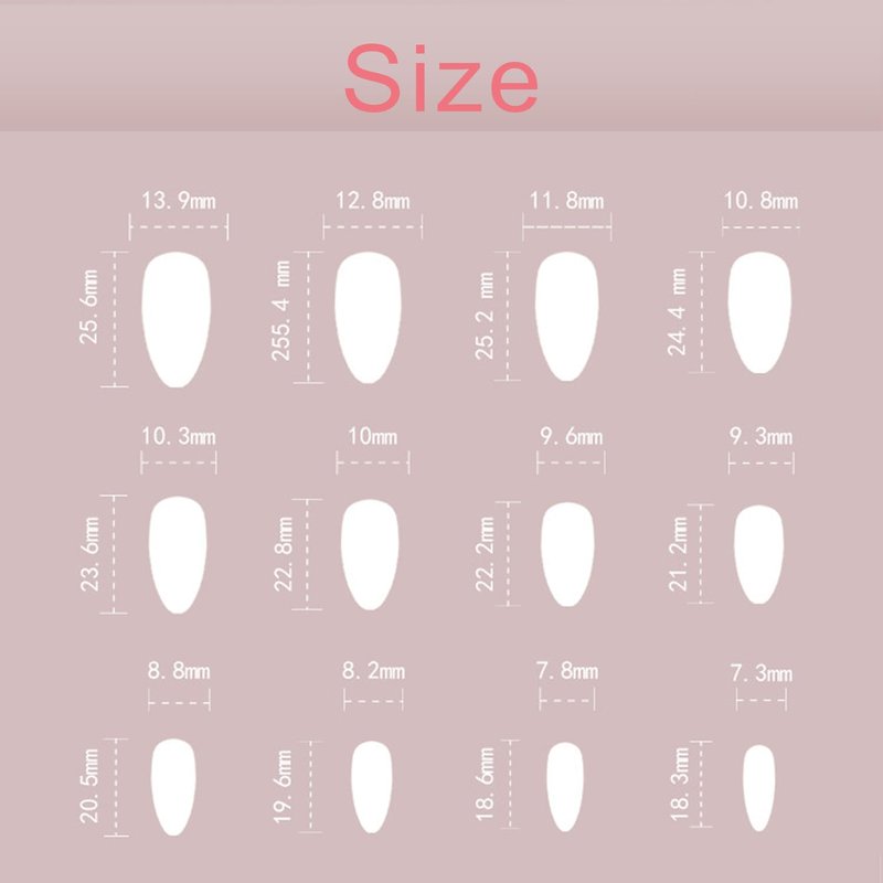 - 【Package & DIY Nails】You'll get 24 false nails in 12 sizes. 1 mini nail file, 1 small wooden stick, 1 piece of adhesive tab glue. You can safely choose a fake nail that fits your finger size and DIY your desired nail shape.