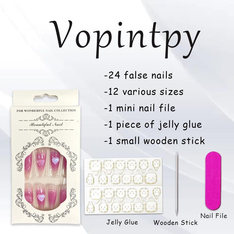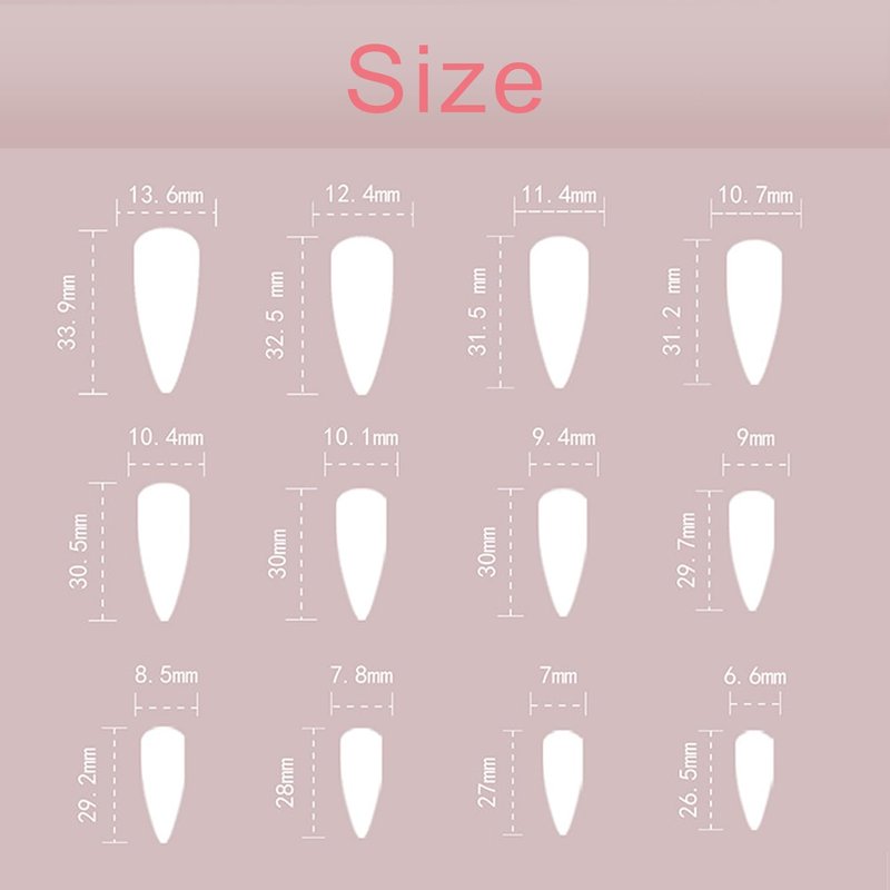 - 【Package & DIY Nails】You'll get 24 false nails in 12 sizes. 1 mini nail file, 1 small wooden stick, 1 piece of adhesive tab glue. You can safely choose a fake nail that fits your finger size and DIY your desired nail shape.