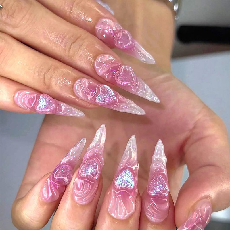 - 【Has Many Uses】Glitter 3D heart design false nails , extra long almond shape. Perfect for nails salon, DIY home nails art,used on wedding ,prom party ,dating.It is perfect gift for girlfriends, wives, women and girls.