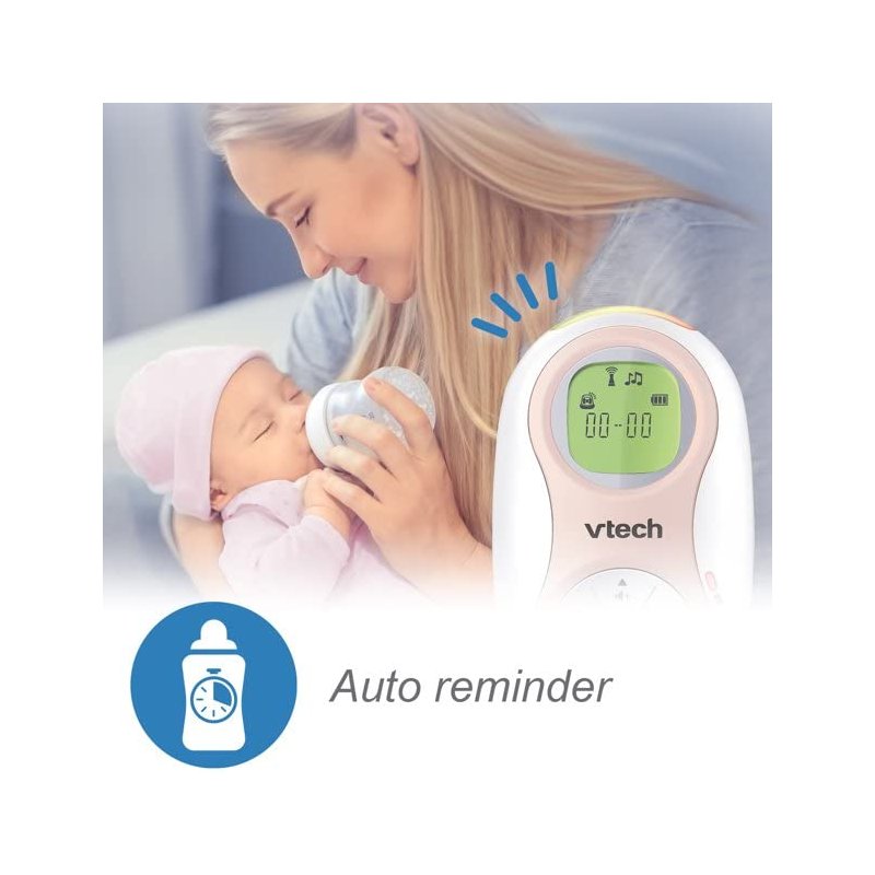 - Up to 1,500 feet of range; Night light on baby unit; Dual-Unit Rechargeable battery; Soothing Lullabies; Record your own story or message - up to 20 seconds in your own voice; Two-way, talk-back intercom; Temperature sensor; Interchangeable faceplates; Feeding, diaper change, and sleep reminder; DECT 6.0 digital technology; Backlit display with temperature reading; Belt clip; 3-level sound indicator; Secure digital audio transmission; Low-battery alert on the parent unit; Volume Control