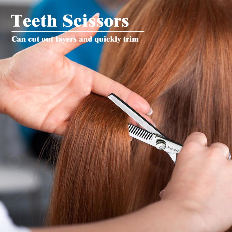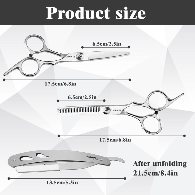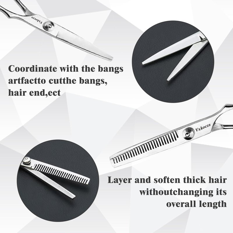 - The hair cutting kit includes a pair of barber scissors and thinning shears, the haircut scissors are suitable for cutting bangs or shawl hair, the thinning scissors can effectively thin hair, add layers to hair, thin thick hair or wigs, add texture to hair and create a fashionable look.