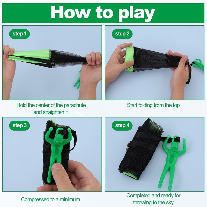 - ✅Easy to use: The parachute toy is easy to operate, before throwing it into the air, just straighten the center point of the parachute, slowly roll up from the top to the paratrooper, and roll the parachute toy to the smallest size. With no assembly required, tossing the parachute toy into the air and watch it slowly descend.