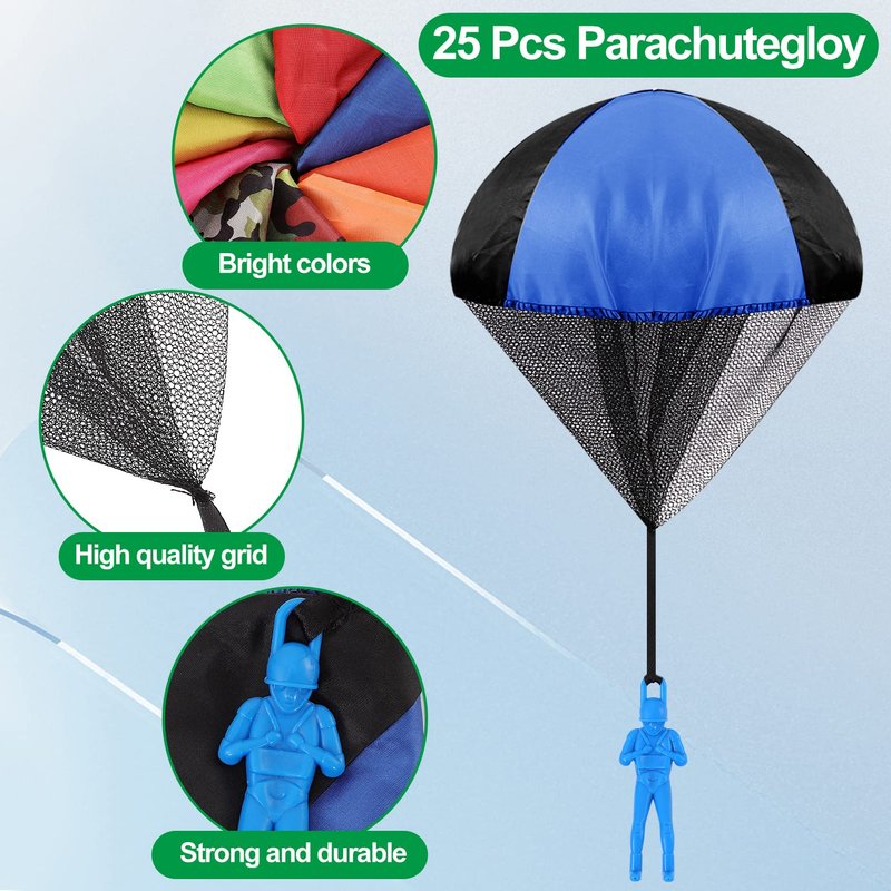 - ✅Great Value Pack: There are 25 parachute toys with 9 colors in the package. Each parachute toy comes in 1 individual bag. Blue, orange, green, yellow, red, rose red, multicolor, 3 pcs parachute toys for each color of 7 colors, 2 pcs parachute toys each for camouflage and army green. Abundant quantity and rich colors to meet your kids various needs.