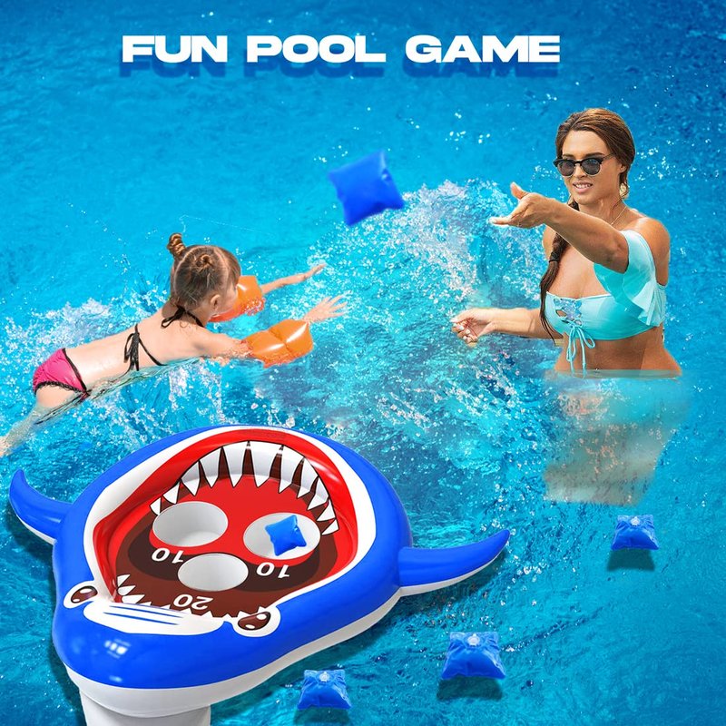 - Inflatable Shark Toys Set: A shark pattern cornhole game board, 4 Waterproof buoyant bean bags. Please Note: The bean bags need to be fill water inside rather than inflate