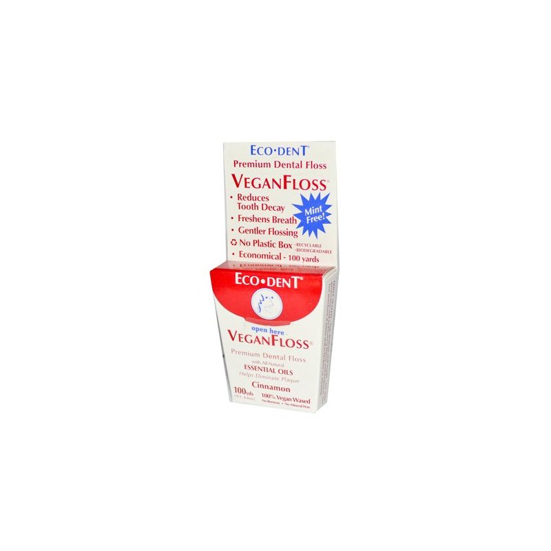 ECODENT FLOSS, CINNAMON VEGAN WAXED IS A 100% VEGAN FLOSS CONTAINING NO BEESWAX OR MINERAL WAX. THIS PREMIUM DENTAL FLOSS IS CRAFTED WITH ESSENTIAL OILS THAT FRESHEN BREATH, HELPS ELIMINATE PLAQUE AND REDUCES TOOTH DECAY. THERE ARE NO ANIMAL INGREDIENTS AND NO ANIMAL TESTING. THE 100 YARD SIZE MEANS LESS COST PER FLOSSING THAN SMALLER SIZES. EACH RECYCLABLE BOX CONTAINS 100 YARDS OF FLOSS. SEE SIDE LABEL FOR CAUTIONS.