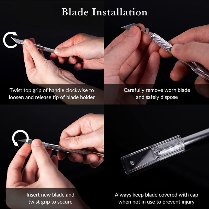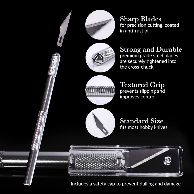 - Safety & Security - Rest easy knowing that these hobby knife set handles hold each crafting knife blade tight in place for secure & precise cuts. Each craft knife comes with a safety cap that prevents from errant marks, making it the ideal art pen knife set on the go