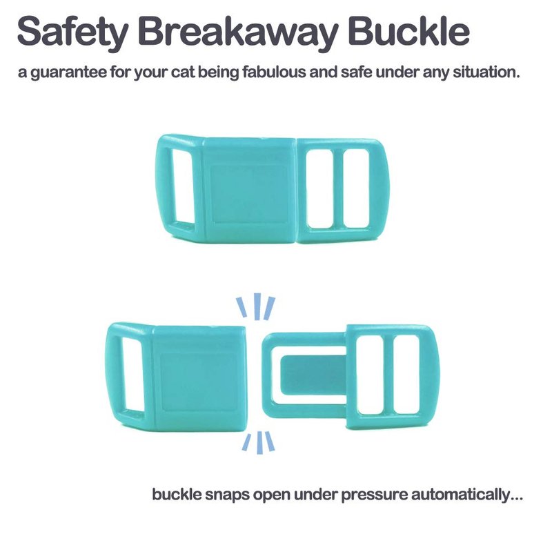 - Standard Size for cats. Neck 9”-15” (22.8-38 cm), Width 3/8” (1.0cm); Safety Breakaway Buckle. This collar comes with a bell and a crescent moon charm.