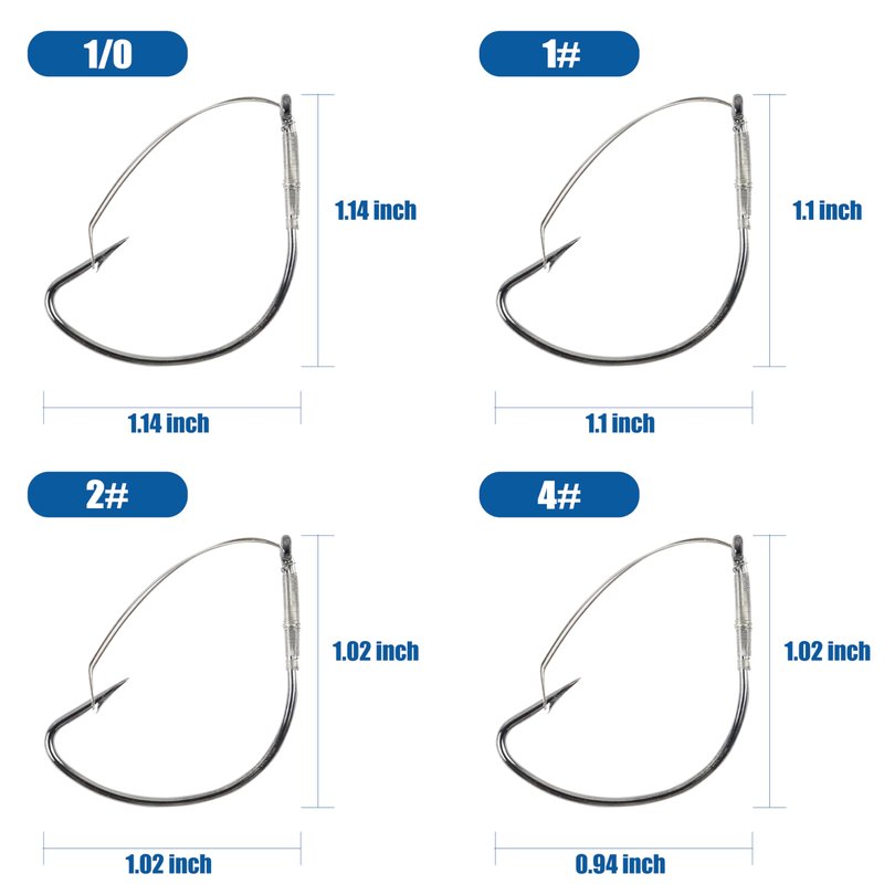 - Package Includes: 4 Sizes weedless wacky rig hooks: 4#, 2#, 1#, 1/0, 25pcs/50pcs Hooks for each size