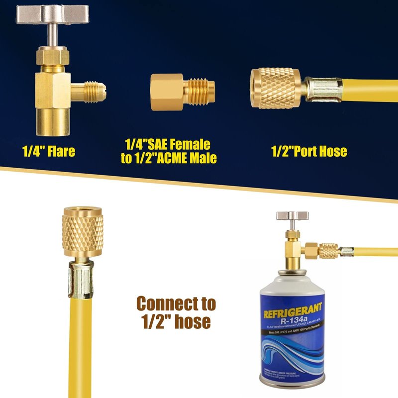 - R134A Refrigerant Tank Adapters: Two sizes are 1/2" ACME female to 1/4" SAE male and 1/2" ACME male to 1/4" SAE female.