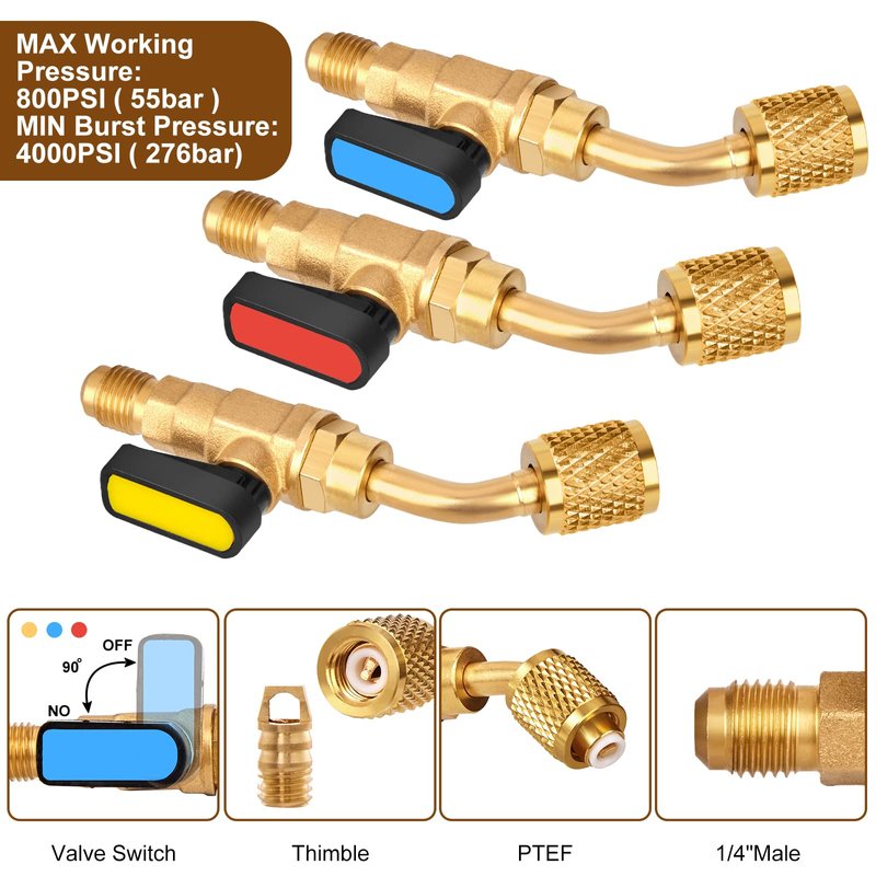 - Material: Our air conditioner refrigerant angled ball valve kit is made of solid brass, which makes it corrosion resistant, durable and sturdy, provides a longer service life.
