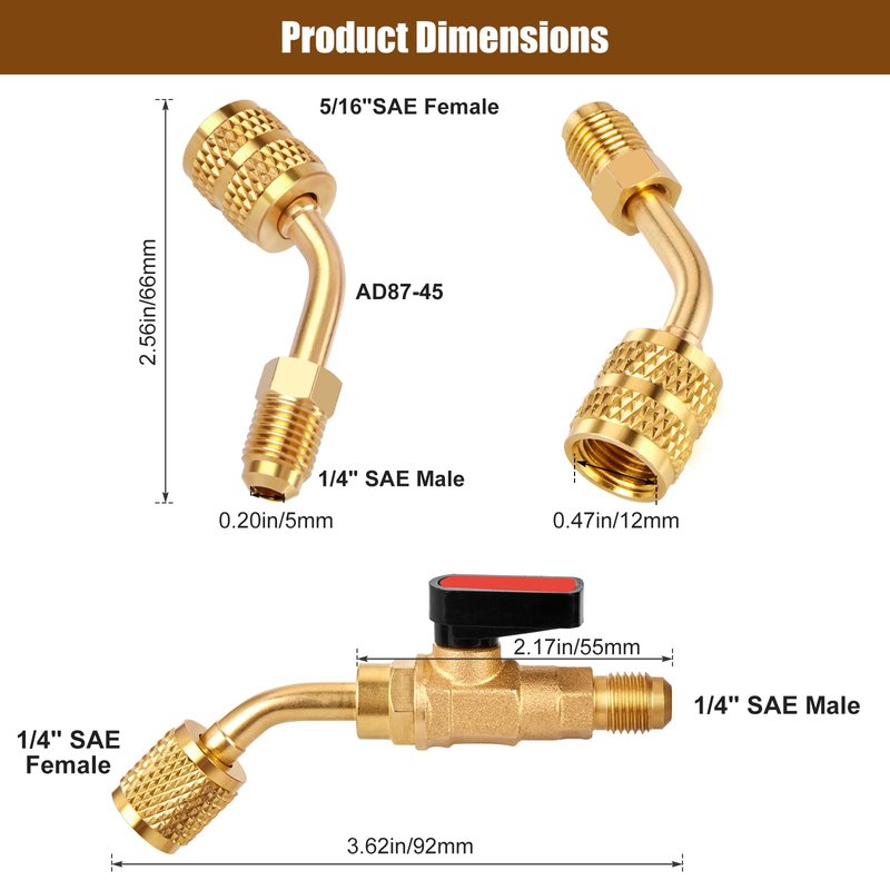 - 45 Degree R410a Adapter: 1/4" male SAE x 5/16" SAE female adapter, Converts the 5/16" SAE charging vacuum ports(R410A type) to accept 1/4" SAE gauge hose set, which is ideal for R410A air conditioner, HVAC and other refrigeration equipments.