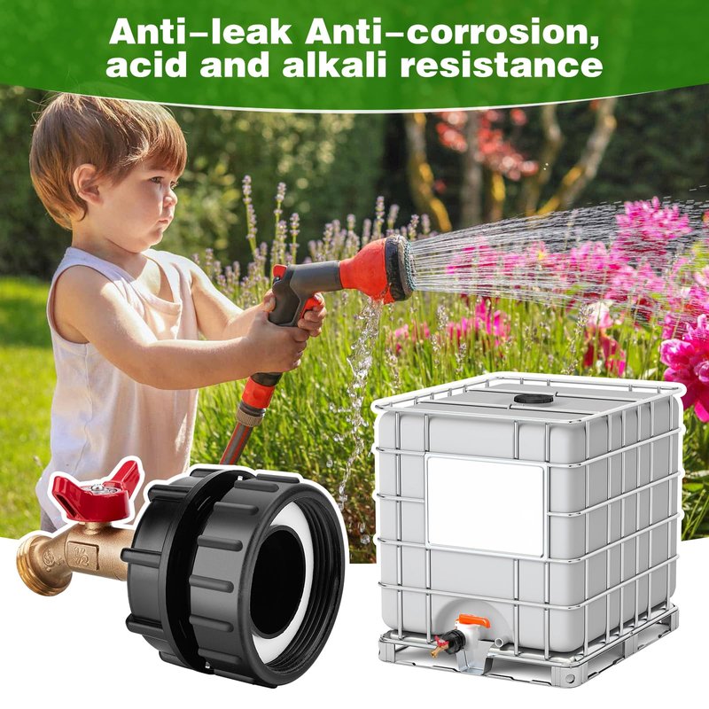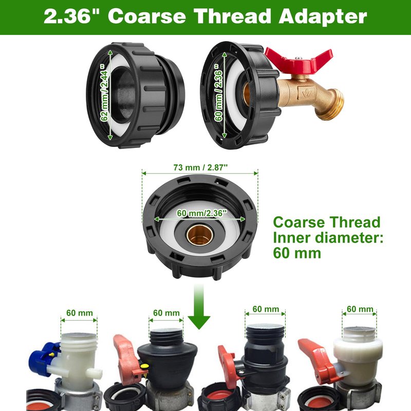 - What You Get: 2.44" Fine Thread IBC Tote Adapter + 2.36" Coarse Thread Adapter + 1/2" Male NPT Inlet × 3/4" GHT Outlet Water Shut-off Valve Faucet + Garden Hose Quick Connector + Thread Seal Tape.