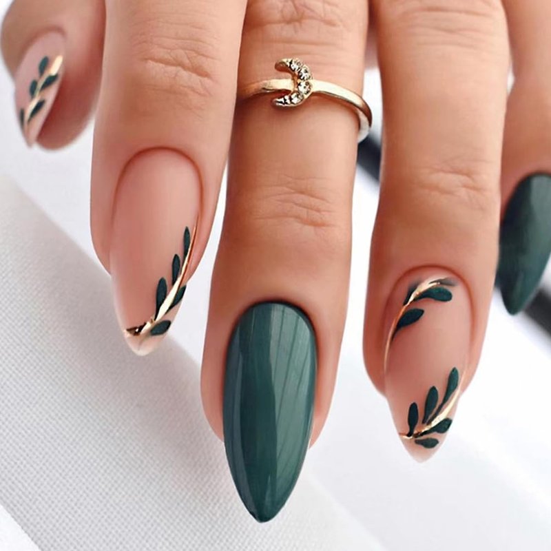 WAFOLOZE Almond Press on Nails Medium Fake Nails Dark Green Gloss False Nails with Matte Nails&Green Leaf Designs Glue on Nails Acrylic Nails Press ons Artificial Nails Stick on Nails for Women 24Pcs