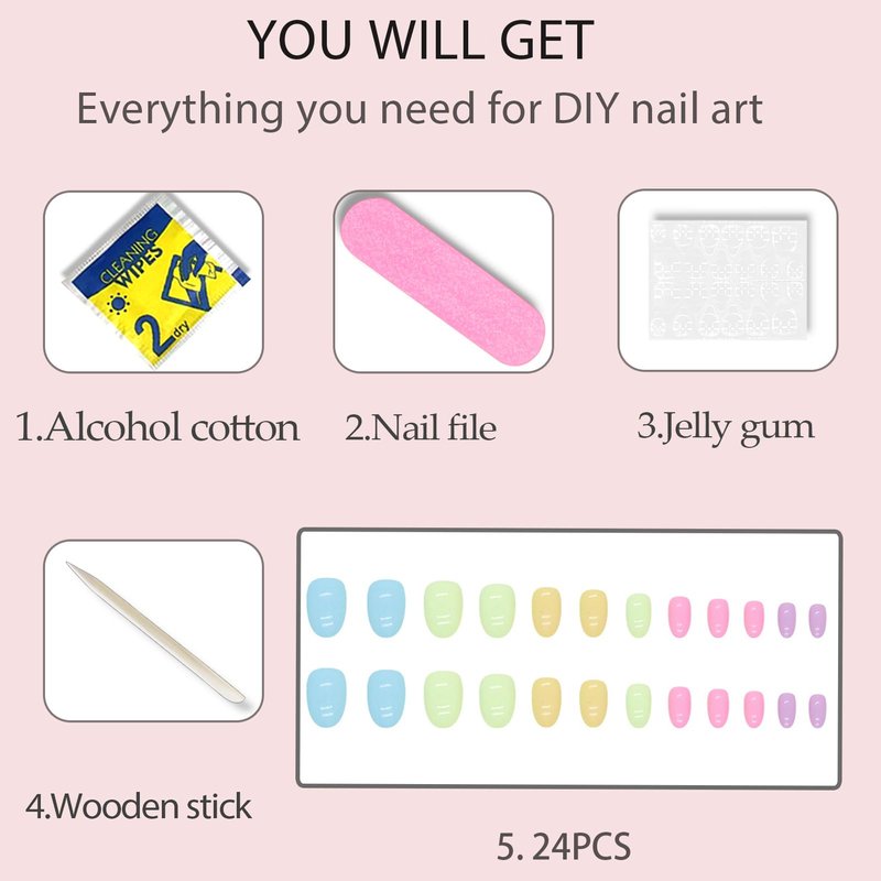 - 💖【Almond Fake Nails Package】- 24pcs/12 sizes almond nails,1 nail file,stick 1, wipes 1, jelly glue 24。( You can choose the best fake nails for you, which are easy to trim and file into any length and shape you like.)
