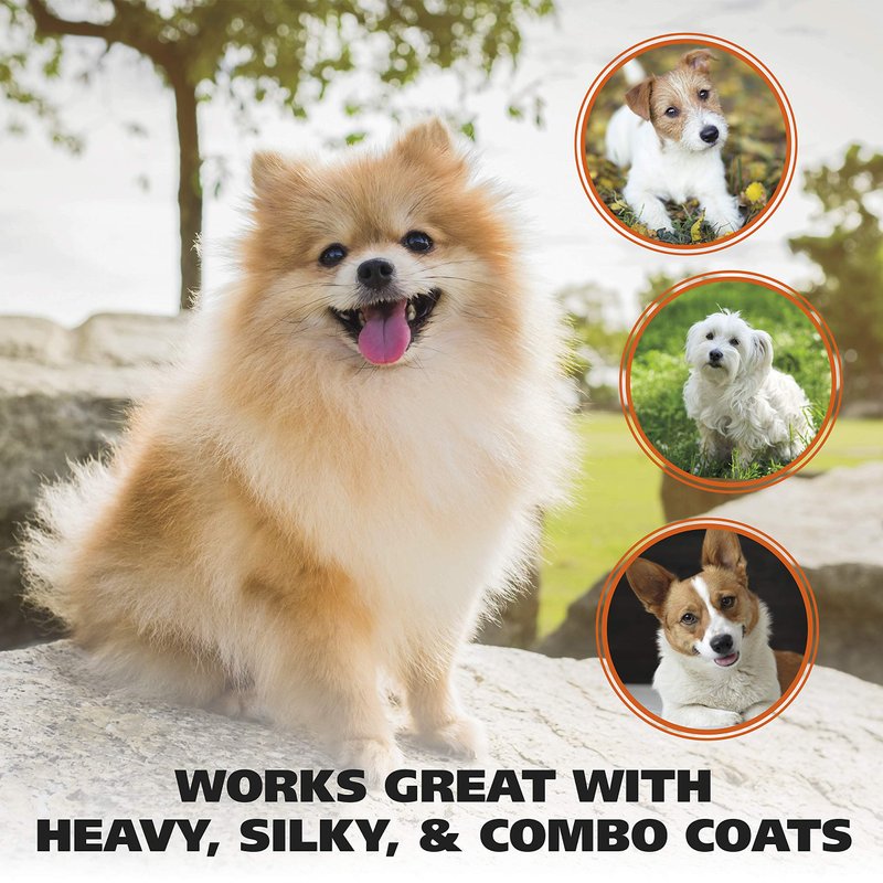 - Double Sided Design – Soft bristles are used to smooth and shine the coat while the stainless-steel pins are used to remove deep lower level fur that normal bristles miss