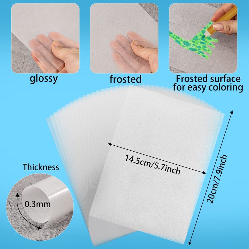 - 【Shrink Plastic】 Approx. 7.9 x 5.7 inch / 20 x 14.5 cm, 0.3 mm thick. Shrinks to 20% of its original size after heating. All are semitransparent, one side frosted and the other glossy.