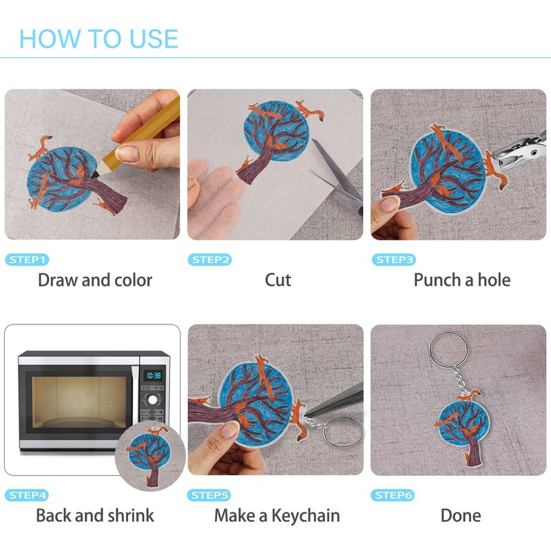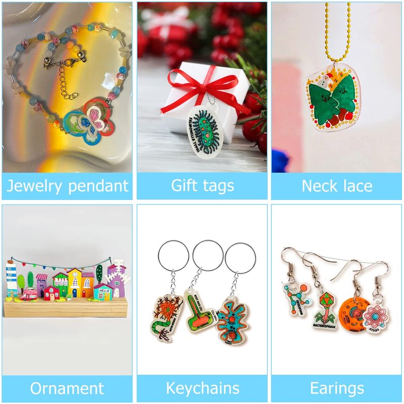 - 【Function】 These shrink films are suitable for DIY pendants, earrings, keychains, jewelry, buttons, gift tags, zipper pulls, bookmarks and ornaments, endless fun of making shrink.