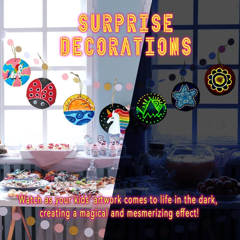 - 【Glow in The Dark Painting】: The dazzling Glow in the Dark Wooden Painting Kit, a mesmerizing craft activity that will ignite your kids' imagination! With its glow in the dark feature, this painting kit adds an extra element of excitement. Watch as your kids' artwork comes to life in the dark, creating a magical and mesmerizing effect.