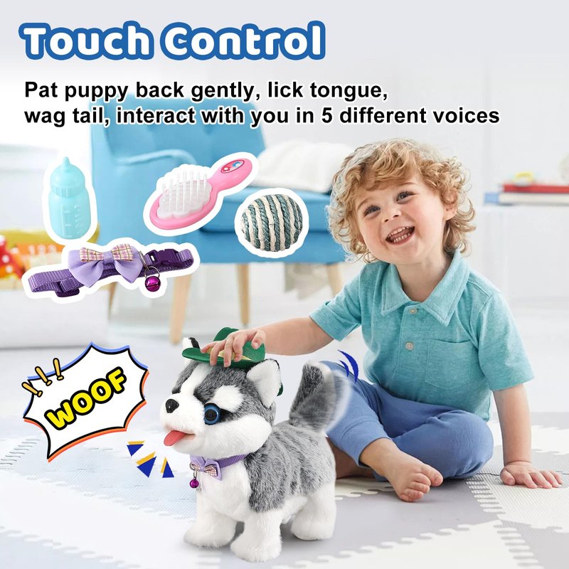 - Newly Husky Walking Barking Dog:Walking husky dog toy is different from ordinary. Walking with leash singing, licking, barking, wagging, nodding, it learns to talk like a real puppy. Wear a green hat, gently pat it on the head, woof, friendly and positive interaction. A great toy dogs for kids!