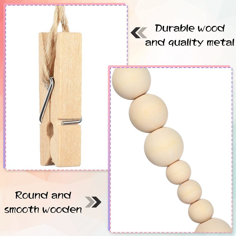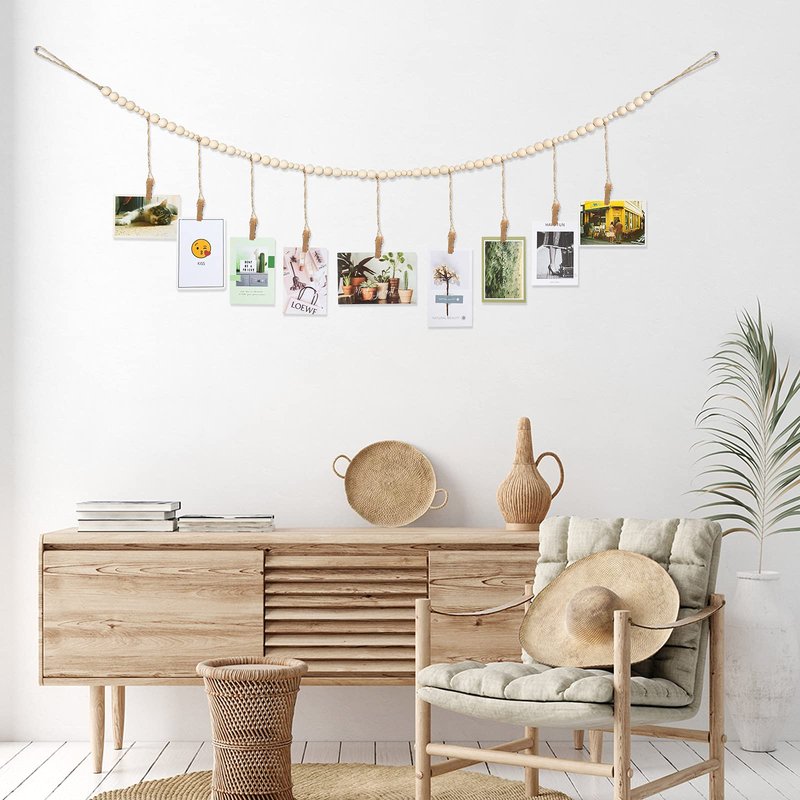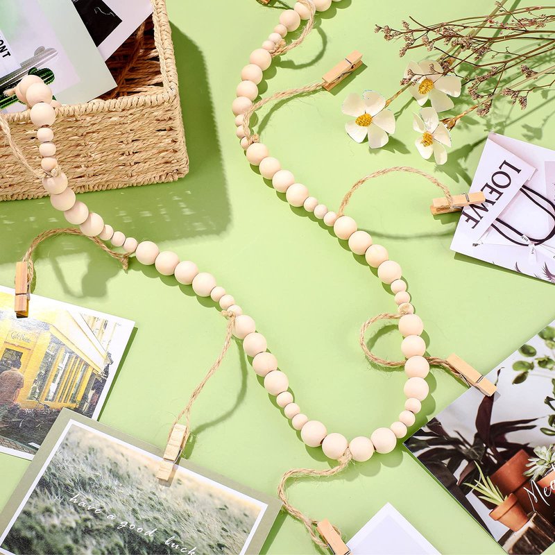 Wall Hanging Photo Display with Wooden Beads Garland 4 Feet Boho Collage Picture Frame DIY Picture Photo Frame Set with 9 Wood Clips for Rustic Country Home, Office Nursery Room Decoration(2 Pieces)