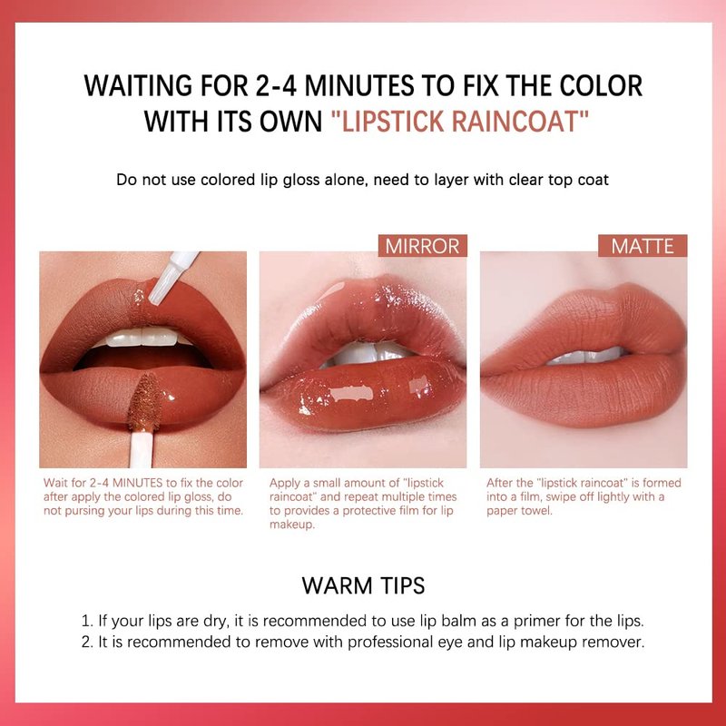 - *【Lipstick raincoat effect】: the original lip color on top of the transparent lipstick, to play a waterproof, non-decolor, non-sticky cup effect.
