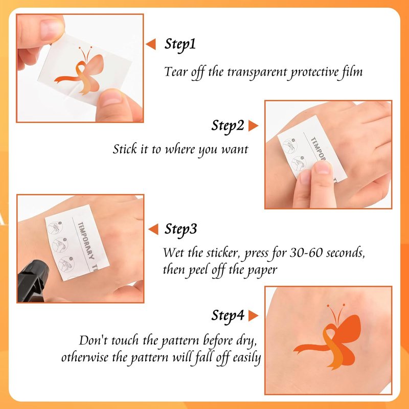 BEAUTIFUL TATTOO -- The tattoo stickers are made of safe material, with bright color and non-toxic. There are different words and symbols on the stickers, such as butterfly and orange ribbon. And the tattoo can maintain 3-5 days.