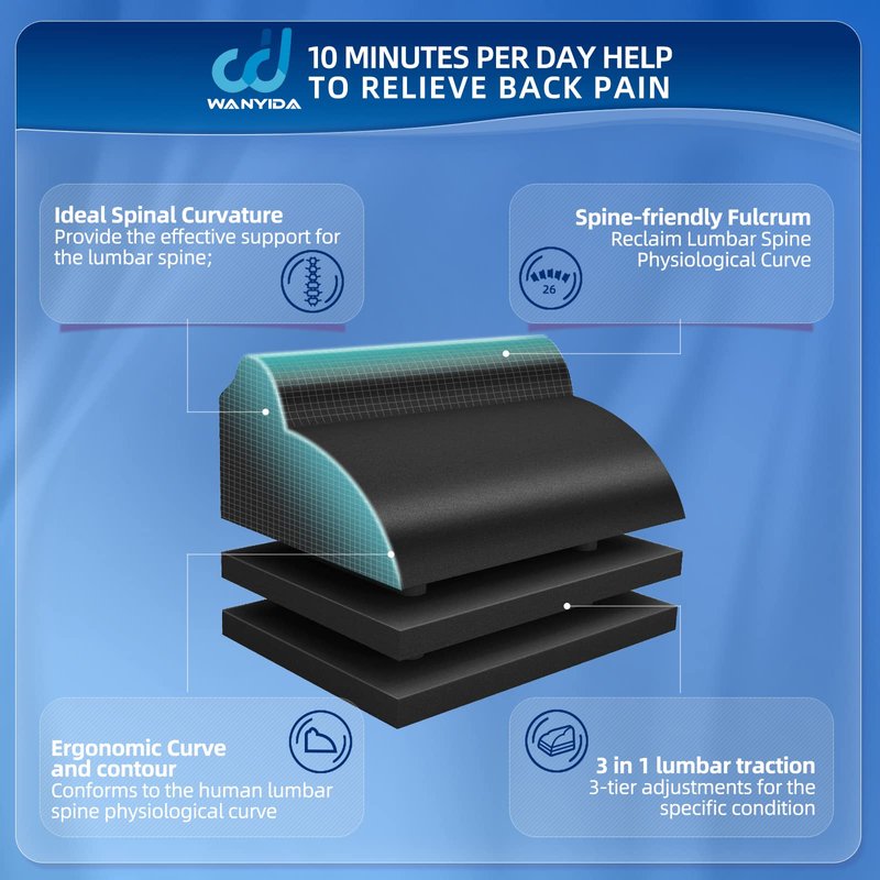 WANYIDA lumbar stretcher is a device designed to improve spinal alignment and relieve back pain by providing a gentle, passive stretch to the lower back. It is made from high-density foam that is designed to provide a comfortable, yet supportive surface for the lower back. It is contoured to fit the natural curve of the lower back, which helps to support the lumbar spine and promote spinal alignment.To use the back stretcher, you simply lie down on your back and place the device under your lower back. The device should be positioned so that the curve fits snugly against your lower back, with your hips and legs straight and your arms at your sides.