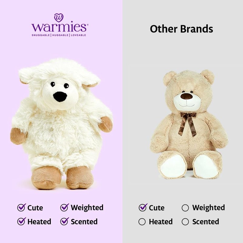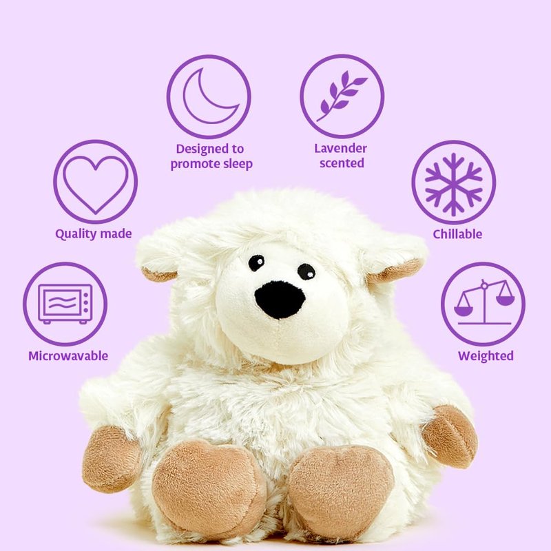 - Warmies Junior Microwavable Stuffed Animal: Smaller in size, Sheep is a snuggable, huggable, lovable weighted plush toy for all ages that can be heated for hours of soothing warmth and comfort, or chilled for cooling relief. 9 inches tall. 0.5 lbs.