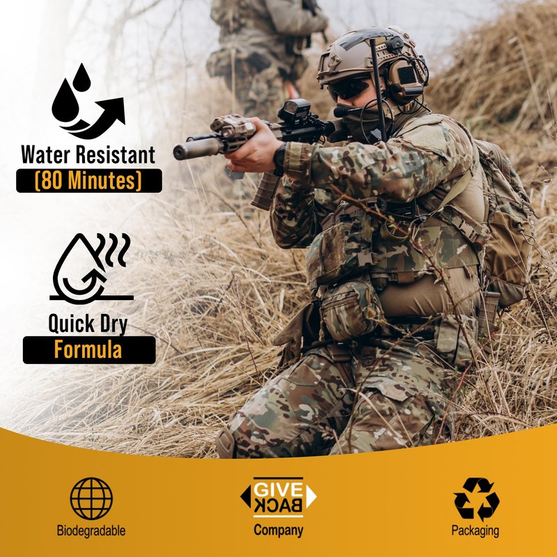Discover the ultimate in sun protection with Warrior Sunscreen SPF 30 Lotion. Engineered for those who thrive in the great outdoors, our broad-spectrum sunscreen delivers superior defense against harmful UVA and UVB rays, helping to prevent sunburn and premature skin aging. Whether you’re a veteran, soldier, hiker, or outdoor enthusiast, this lotion base sunscreen is designed to meet your needs. Featuring a rugged camo presentation and a TSA-compliant size, Warrior SPF Lotion is ideal for veterans, soldiers, hikers, and outdoor enthusiasts who are always on the go. Its biodegradable formula ensures that while you protect your skin, you're also taking care of the environment. Our moisturizing sunscreen is more than just protection; it's nourishment. The hydrating broad-spectrum formula keeps your skin moisturized and healthy, even in harsh conditions. Hypoallergenic and designed for sensitive skin, it's suitable for everyone. With up to 80 minutes of water and sweat resistance, Warrior high SPF face sunscreen stays with you through intense activities, ensuring you remain protected. Embrace your next adventure with confidence, knowing that Warrior Sunscreen SPF 30 Lotion has got you covered.
