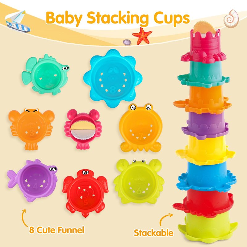 - Creative Early Learning Toys: 4 Colorful stackable boats float and link together to create a "little boat train", boats have funny faces bring joy to kids. Every stacking cups are have numbers at the bottom which toddlers can learn number 1-8 and counting. Kids can learn the concept of shapes, colors, order. Linking, scooping and pouring help develop fine motor skills, too. Three lovely silicone marine toys are suitable for decompression and teaching kid to learn the types of marine animals.