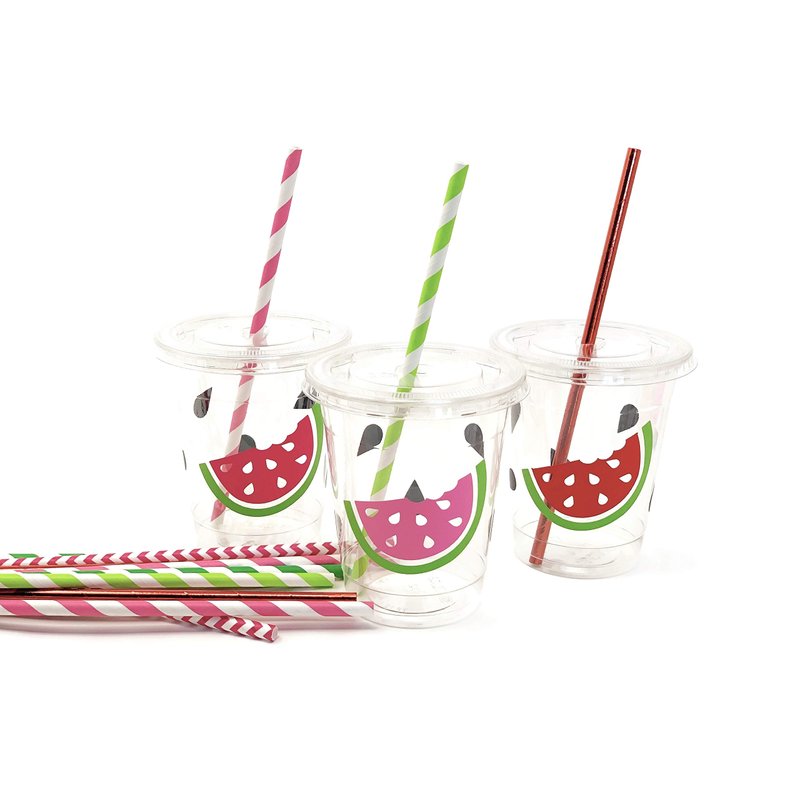 Serve drinks in these adorable watermelon party cups! Each set includes 12 clear soft plastic 12 oz disposable drinking cups with handmade vinyl decals, clear plastic straw slotted lids, and coordinating assorted paper straws. Designed & Handmade in Oregon, USA.