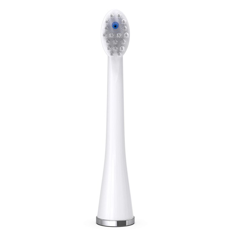 - 2 COUNT: Included within each plastic clamshell package are 2 compact-size replacement toothbrush heads: 1 white with white color ring, 1 white with chrome color ring