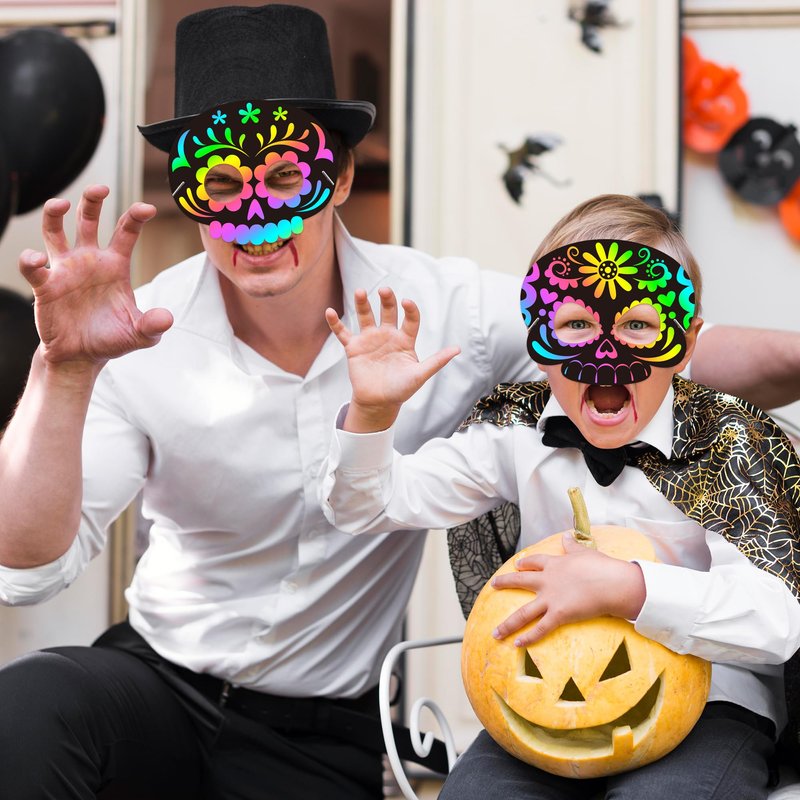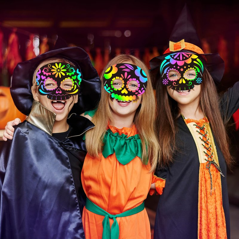 - Creative Mask Gift Set: This is a different painting experience, no need colored pencils and paints, just a light scratch with a wooden stick, you can draw a colorful skull, suitable for Halloween or Day of the Dead party.