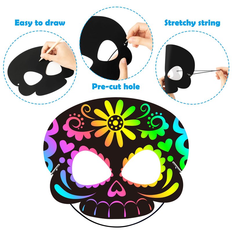 - Easy to Play: Choose your favorite skull pattern and use your imagination, then gently scratch out the pattern with a wooden stick and the card will come out in a brilliant colors! Each scratch mask has pre-cut holes that can be threaded through with elastic string.