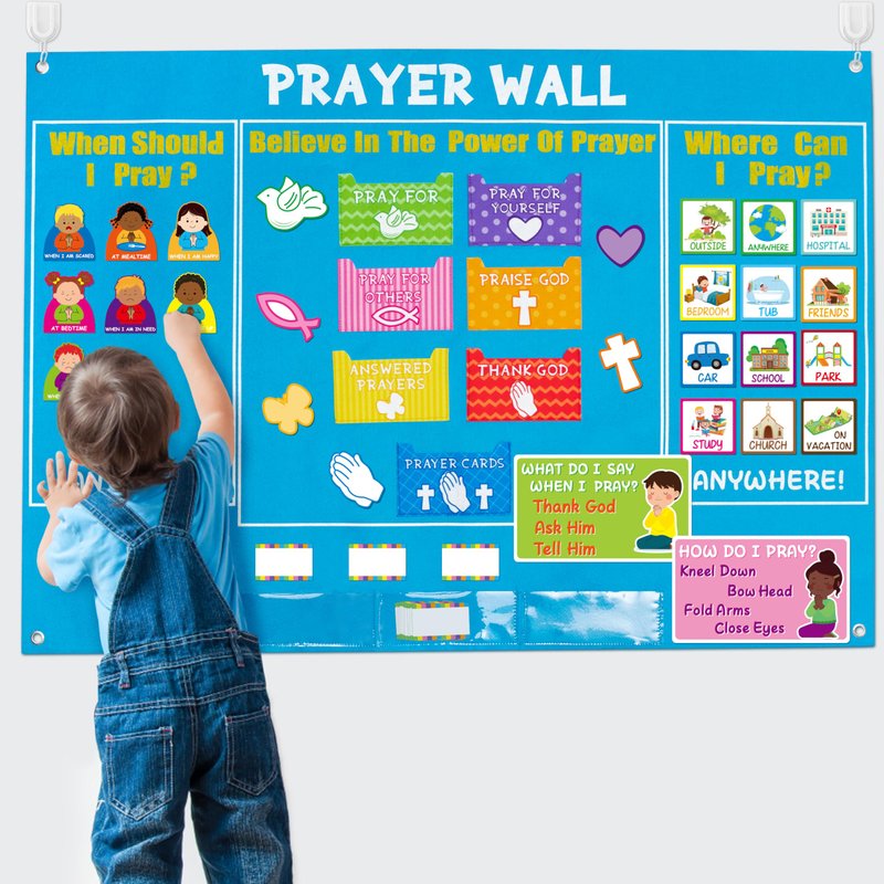 - Unique Design: The prayer wall is printed with three positions, When should I pray, Believe in the power of prayer and Where can I pray. The prayer cards are printed with clear instructions such as Close Eyes, Thank God, Kneel Down, etc. This way people can stick the card in the appropriate position, which is both simple and special and will make for a great prayer experience!