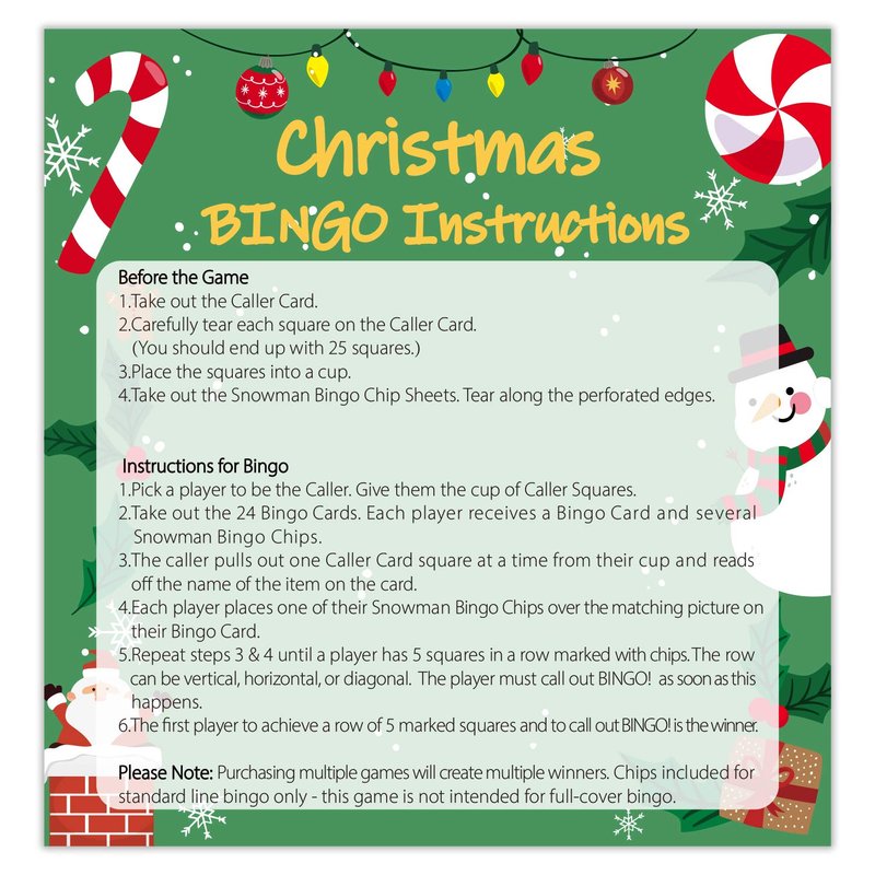 - Warm Tips – There are totally 24 player cards for 24 players and 1 caller to participate in the game. Before the game, you are supposed to tear each square along dotted lines on the caller card chips. In this part, it is no need to use scissor, please keep kids away from dangerous scissors!