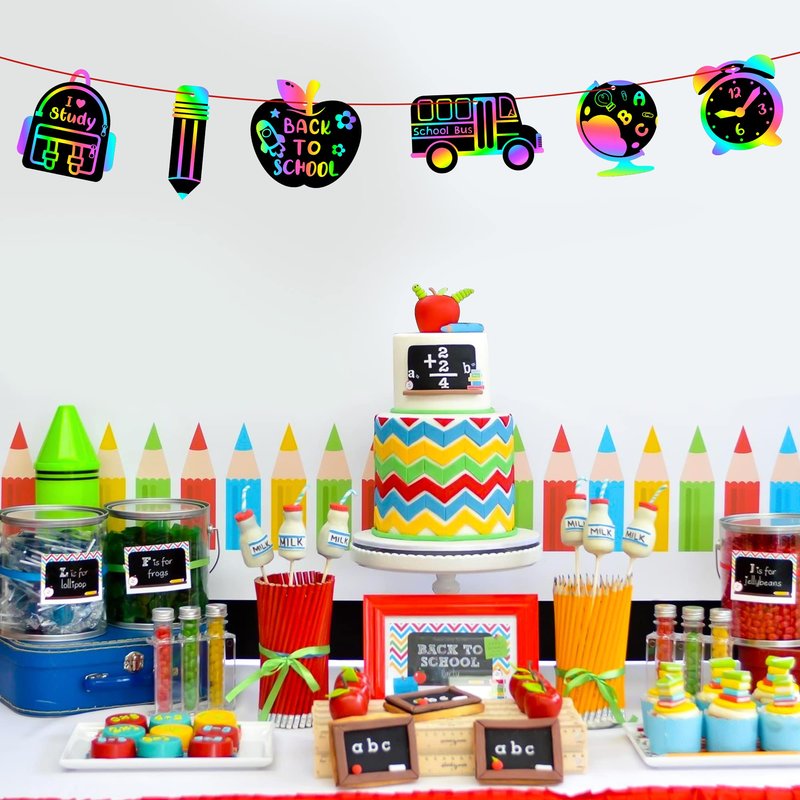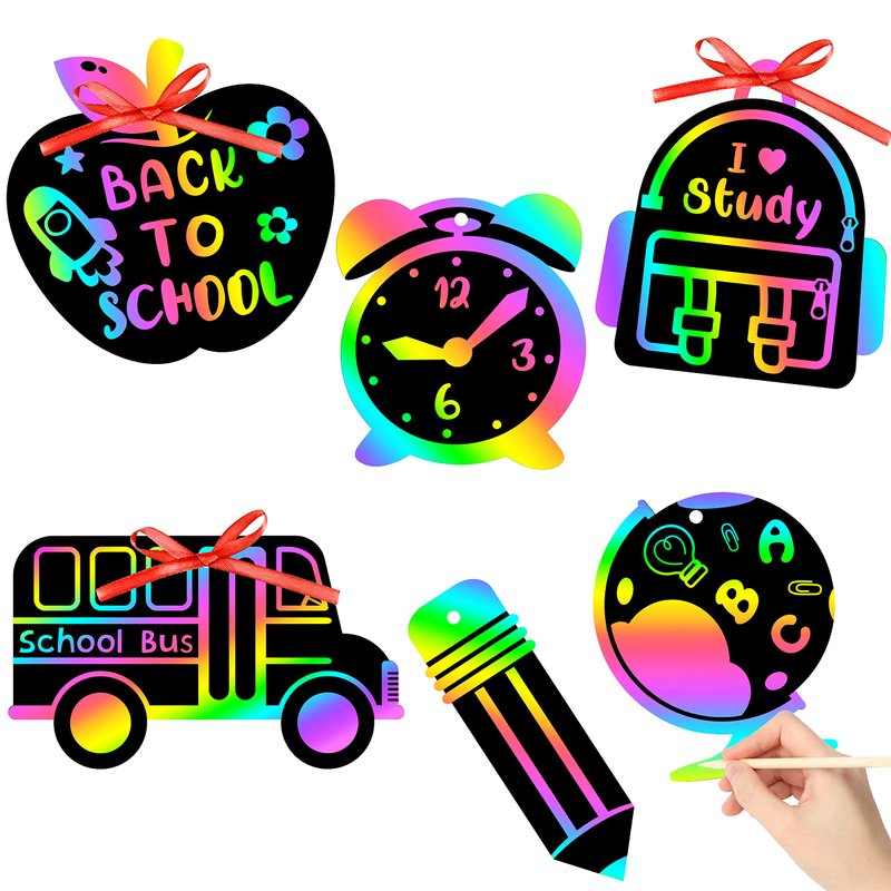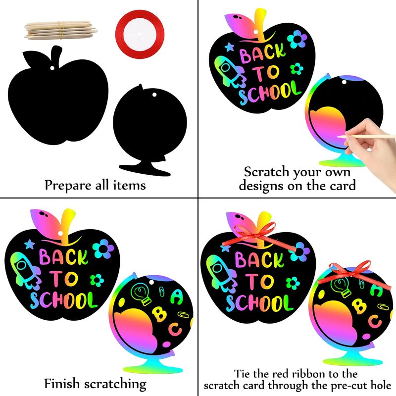 - Value Kit: The package contains 60pcs scratch cards (6 styles, 10 of each). There are a lot of school elements, for example bus, bag, pencil, globe and clock. And 20pcs wood stick, 1 bundle of red ribbon. It is a special gift for kids to DIY your own unique back to school scratch card.