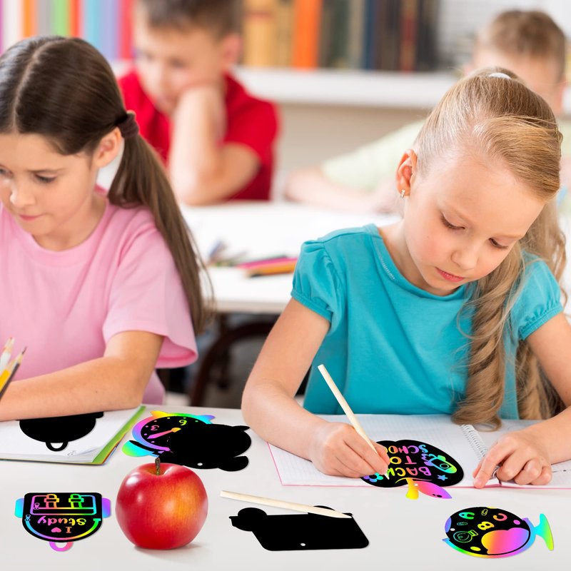 - Easy to Play: Only use the wooden sticks to draw on the black matte coating surface. Use your imagination and draw various patterns. When finished, you can use ribbon to go through the holes in the card for decorating gifts or party. You also can give it to your classmates as a gift or collect it as your own masterpiece!