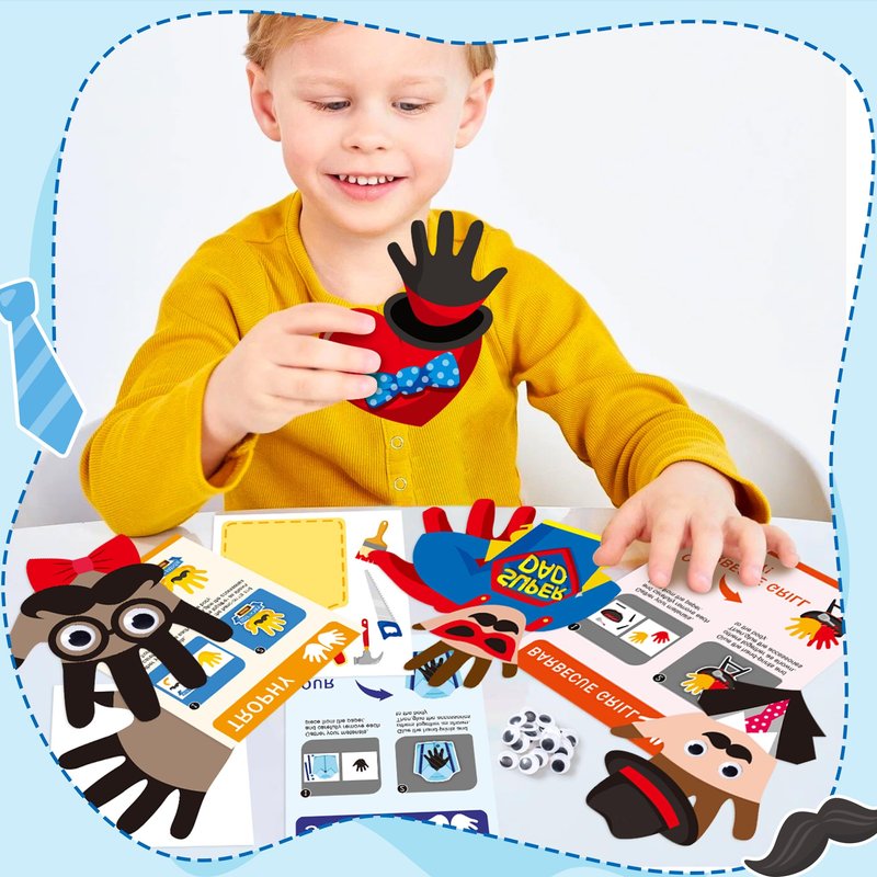 - Handprint Craft Set: This handprint art craft for children aged 3+ includes 12 pre-cut dad print cards, 12 instructions, 2 sheets of double sided tape, some eyes and a colorful gift box.