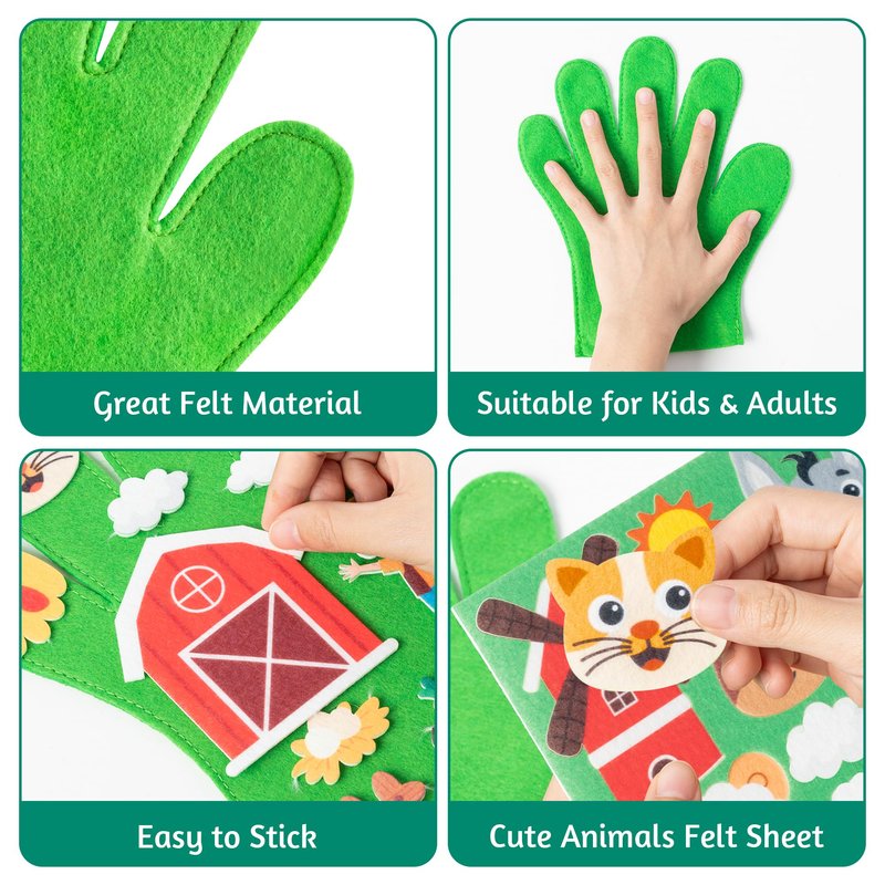- Animal Felt Set: You will receive 2 felt gloves and 2 sheets of farm animal felt, suitable for kids to use their creativity to create interesting farm stories, the felt gloves can be decorated again and again to design different animal scenes.