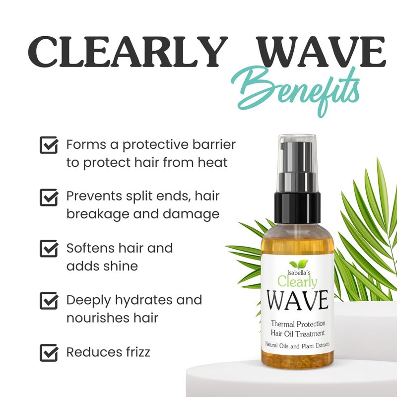 Protect your hair from heat while making it more manageable, softer and stronger. Isabella's Clearly WAVE is an antioxidant rich blend of oils that act as a shield to protect the hair from damaging heat, preventing damage, split ends and breakage. The combination of natural oils and Himalayan salt crystals provide protection but also add texture, strength and shine to your strands. The oils lock in your hair's natural moisture to keep it hydrated and healthy. Use on wet or dry hair after shower as a thermal protector before styling or as a leave in treatment before and after blow drying, straightening or air drying to add texture and volume for effortless waves.