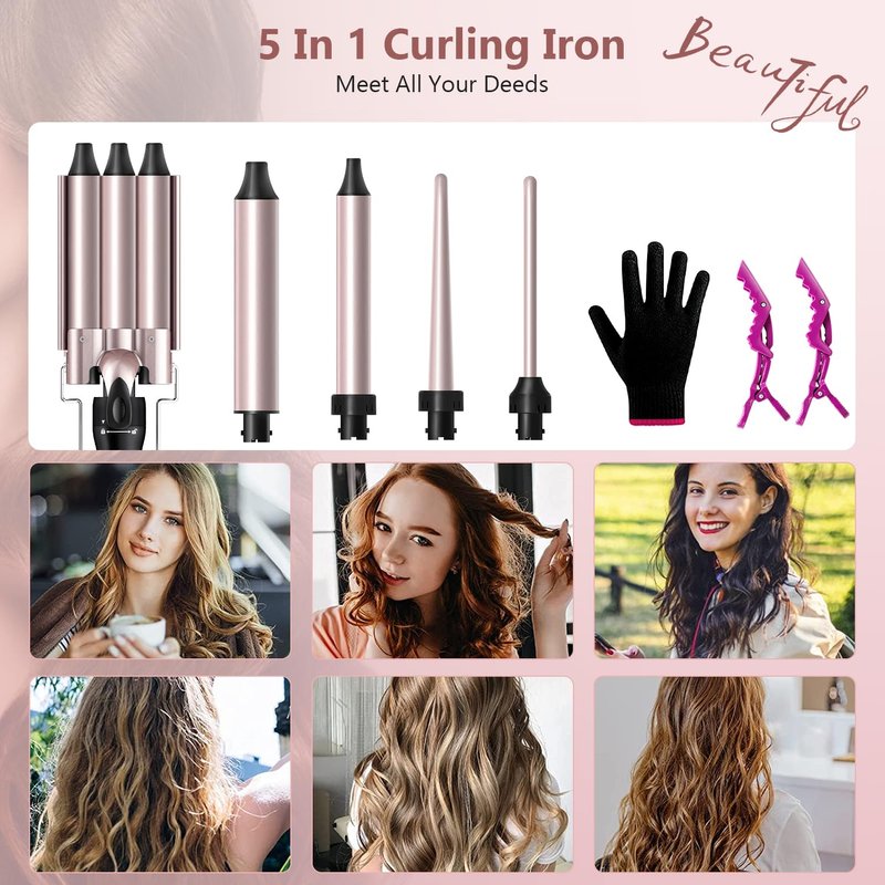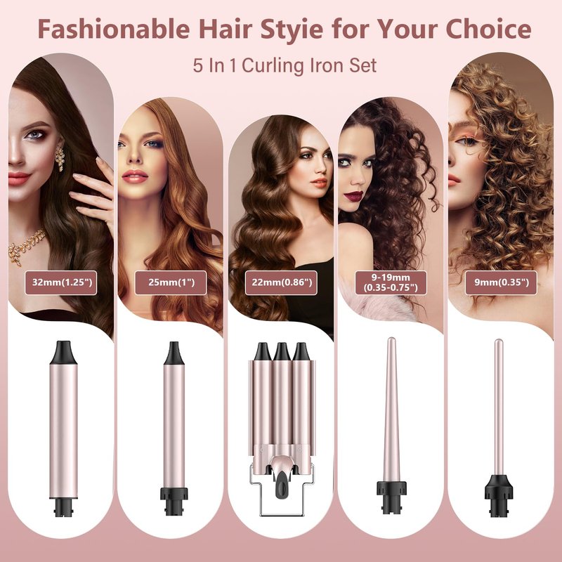 - 【5 in 1 Curling Wand Set】The upgraded version of the curling iron set contains 4 interchangeable ceramic barrels of different sizes and a 3 barrel hair crimper. The waver curling iron package includes a 0.35"-0.75" tapered wand curling iron, 0.35", 1", 1.25" classic curling iron and a 0.86" three barrel hair waver, which can meet the needs of different hairstyles, let your gorgeous hair shine