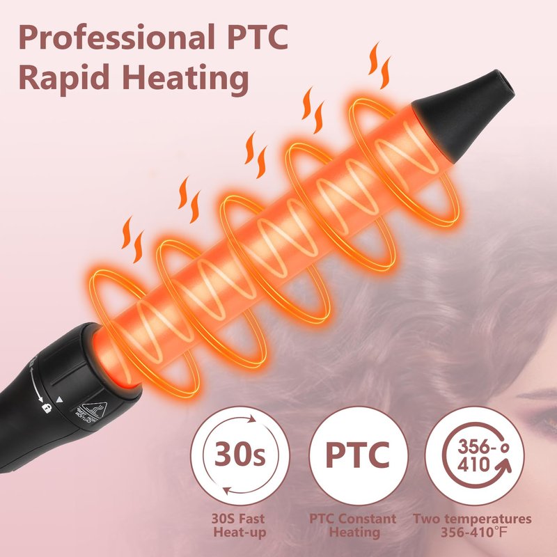 - 【Quick Heating & Healthy Curls】The hair curling wand adopts PTC heating material, which can achieve 30s fast and constant temperature heating. This hot tools curling iron use tourmaline ceramic technology, which can release a large amount of negative ions when used, which can reduce frizz and static electricity, maintain healthy luster, and make your hair healthier, more natural, and longer-lasting